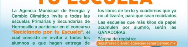 La Agencia Municipal de Energía y Cambio Climático (AMEC) invita a estudiantes de las primarias y secundarias de Hermosillo a participar en el concurso Reciclando por tu Escuela, para recopilar papel. El concurso exhorta a las alumnas y los alumnos a entregar sus libros de texto y cuadernos que ya no utilizan para reciclarlos; los planteles que acumulen más kilos de papel por estudiante serán los ganadores. Las inscripciones son a través de la página http://registroreciclando.agenciadeenergiahmo.mx/ y cierran el próximo jueves 30 de junio; al momento se han inscrito más de 20 escuelas. Del 4 al 8 julio se realizará el… Seguir leyendo »