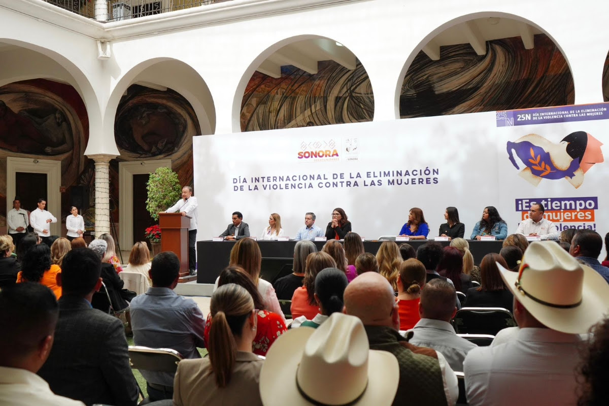 En el marco de la conmemoración del Día Internacional de la Eliminación de la Violencia contra las Mujeres, y en apego a su compromiso de gobierno, por primera vez, Sonora cuenta con un gabinete paritario, mitad hombres y mitad mujeres y se llevó a cabo la implementación del Protocolo de Prevención, Atención y Denuncia de la Violencia contra Mujeres, Niñas y Adolescentes en el Espacio Digital, que capacita a servidores públicos para atender casos de violencia digital y proporciona apoyo integral a las víctimas, posicionando con ello a Sonora como la segunda entidad en contar con esta herramienta, señaló el gobernador Durazo ante integrantes del Gabinete Legal y Ampliado, representantes de asociaciones empresariales y civiles, y personalidades destacadas en diversos ámbitos.