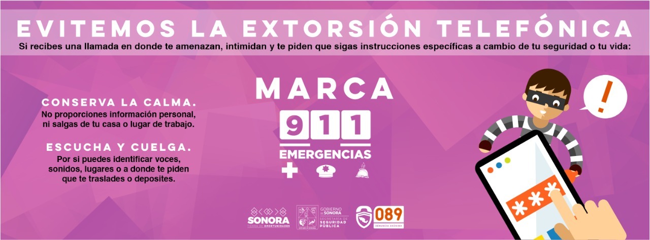 - La Secretaría de Seguridad Pública (SSP) de Sonora hizo un llamado a la ciudadanía a no compartir información personal ante una llamada de extorsión mediante la cual se reciban amenazas, por lo cual recomendó colgar de inmediato, así como reportar el incidente a la línea de emergencias 9-1-1.En su labor preventiva, la SSP informó a las y los sonorenses que, en caso de responder una llamada de un teléfono desconocido, y de recibir amenazas o intimidaciones y se solicite seguir instrucciones, se debe conservar la calma y colgar de inmediato.