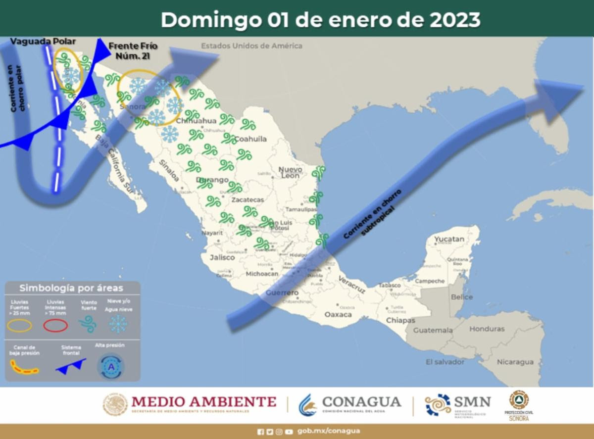 Se espera que este domingo 1 de enero ingrese el frente frío 21 por el noroeste de Sonora, se desplazará rápidamente por el Estado y se asociará a una vaguada polar y la corriente en chorro polar, que se extenderá sobre la entidad, ocasionando rachas de viento fuertes a intensas de 60 a 80 km/h, con temperaturas de frías a muy frías por las noches y mañanas, en las regiones norte, noreste y oriente de la entidad, con probables lluvias dispersas de 20 a 30 mm y caída de aguanieve o nieve en las partes altas de la región serrana.