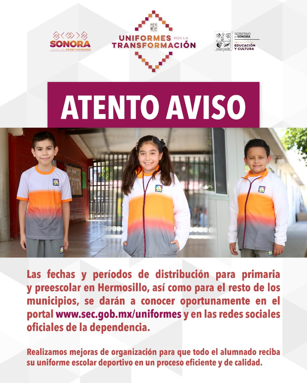 Aclaró que las fechas y períodos de distribución para primaria y preescolar en Hermosillo, así como para el resto de los municipios, se darán a conocer oportunamente en el portal www.sec.gob.mx/uniformes y en las redes sociales oficiales de la dependencia.