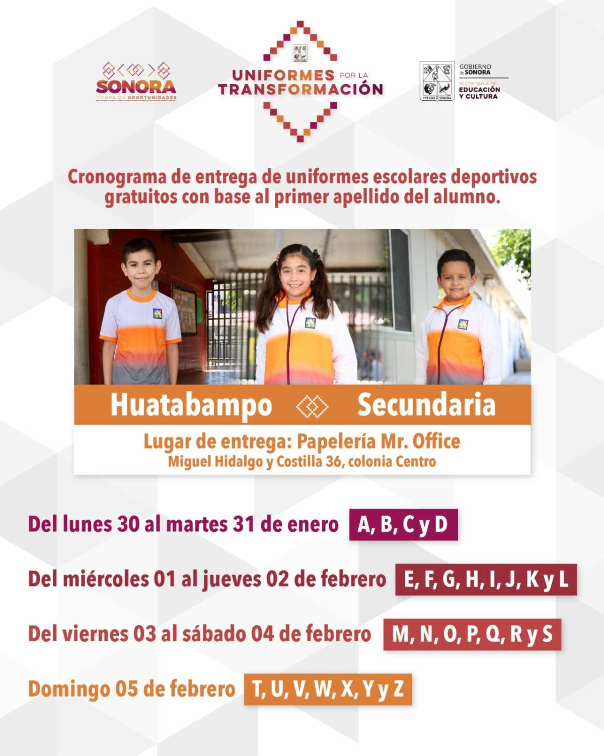 Del lunes 30 de enero al domingo 19 de febrero, se entregarán los paquetes de uniforme escolar deportivo, por orden alfabético, únicamente al alumnado de preescolar en Hermosillo, mientras que en Etchojoa, Huatabampo y Benito Juárez se distribuirá únicamente a estudiantes de secundaria del lunes 30 de enero al domingo 5 de febrero, anunció Samuel Espinosa Guillén.