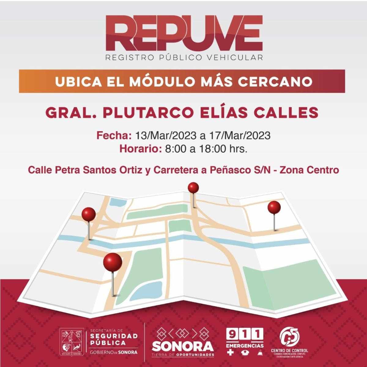 Del 13 al 17 de marzo, Repuve atenderá a la ciudadanía de General Plutarco Elías Calles en horario de 8:00 a 18:00 horas, en calle Petra Santos Ortiz y carretera a Peñasco, zona Centro.