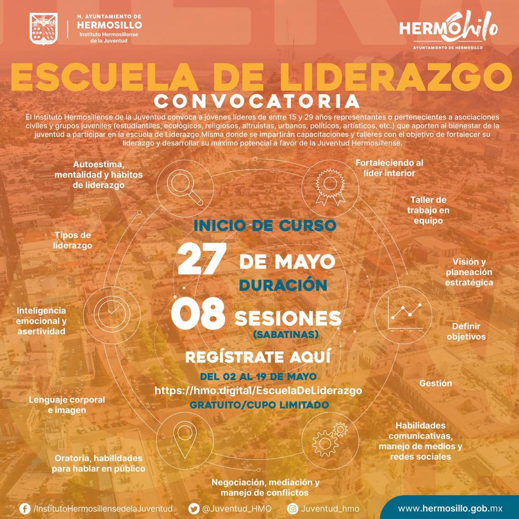 El Instituto Hermosillense de la Juventud (IHJ) convoca a líderes entre los 15 y 29 años a participar de forma gratuita en la Escuela de Liderazgo, que se desarrollará a partir del próximo sábado 27 de mayo.