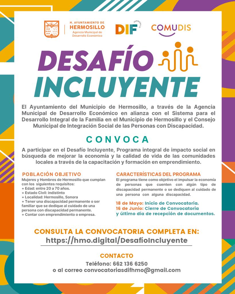 DIF Hermosillo y la Agencia Municipal de Desarrollo Económico (AMDE) lanzaron una convocatoria para el programa Desafío Incluyente, mismo que apoyará a personas con discapacidad y a quienes cuidan de ellas.