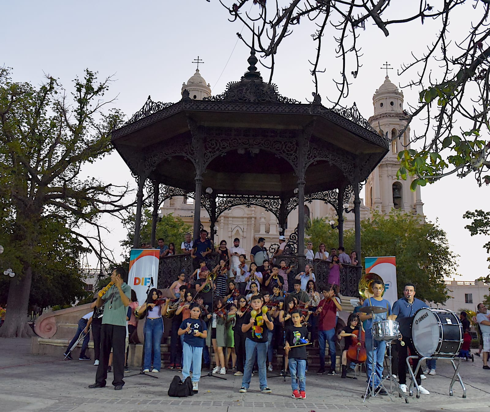Niñas, niños y adolescentes de la Orquesta Sinfónica Infantil y Juvenil de DIF Hermosillo ambientaron a familias en la Plaza Zaragoza interpretando melodías a través del concepto flashmob e invitaron a sumarse a la agrupación.