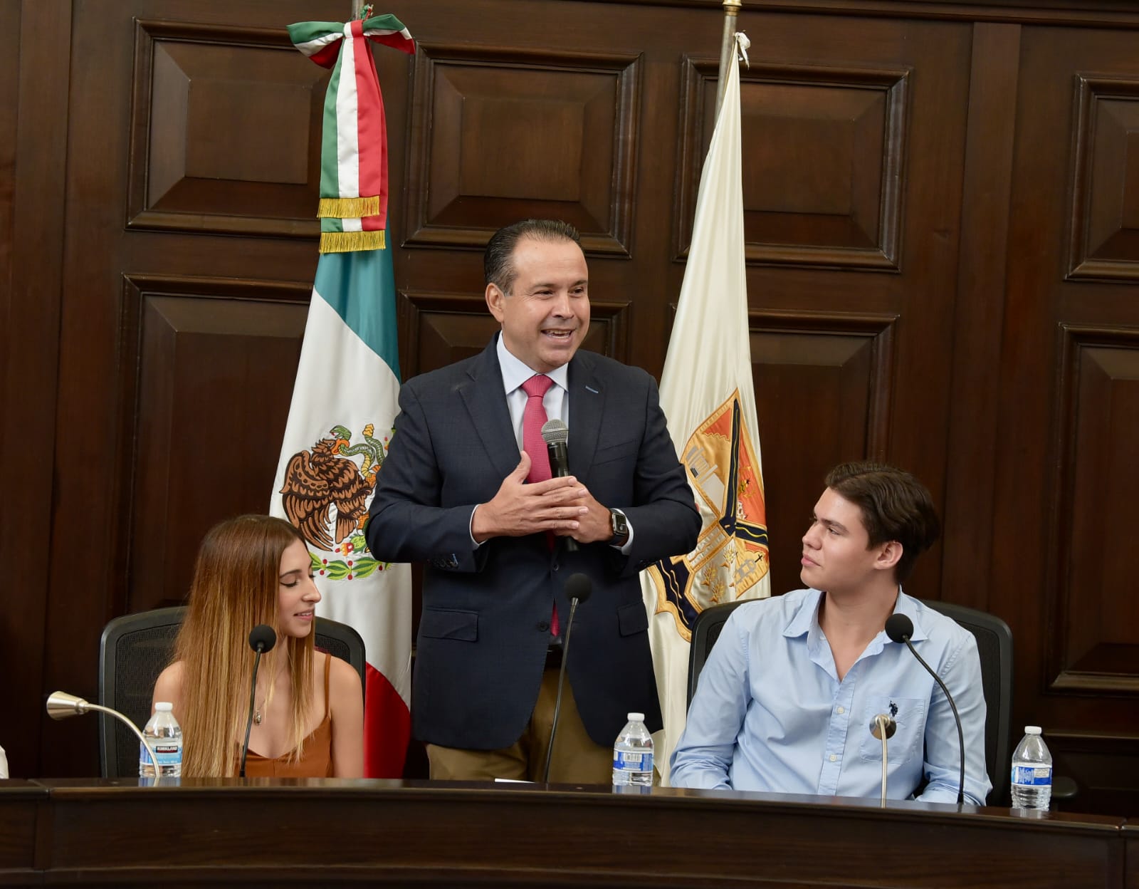 “Este día es muy especial porque ustedes están haciendo historia, es la primera ocasión en la historia de Hermosillo en la que contamos con un cabildo Juvenil” subrayó Toño Astiazarán ante regidoras, regidores y demás integrantes del Cabildo de Hermosillo, así como Dulce Robles, directora del Instituto Hermosillense de la Juventud (IHJ) y el director de Participación Ciudadana, Daniel García.