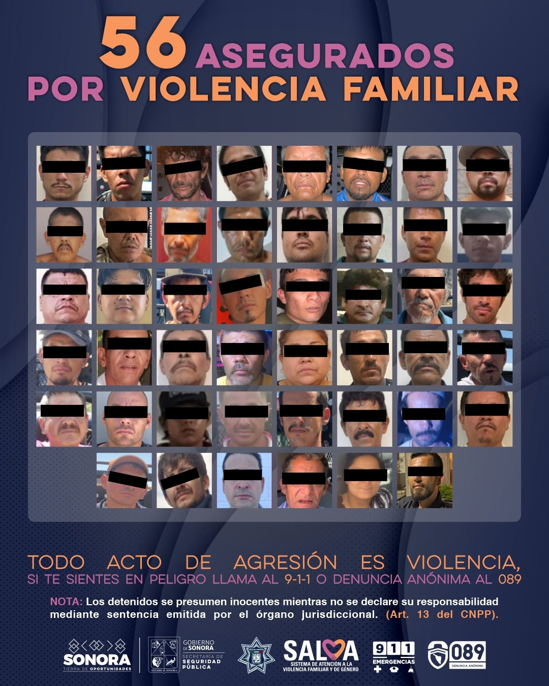 Con la oportuna intervención de los Policías Estatales y la colaboración de personal especializado en el Sistema de Atención a la Violencia Familiar y de Género (Salva) lograron atender a las víctimas y detener durante septiembre a 35 generadores de violencia, en Hermosillo, nueve en Cajeme y el resto en Empalme, Caborca, Guaymas, San Luis Río Colorado, entre otros municipios de Sonora.