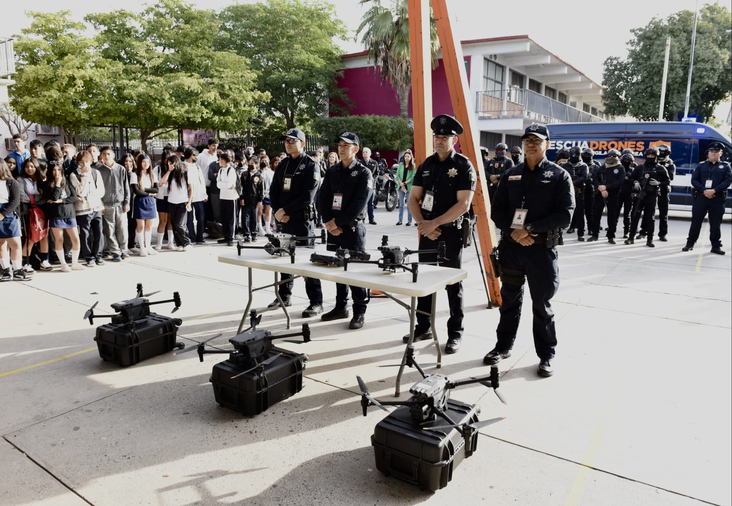 Los espacios exteriores de la escuela lucieron una barredora que opera con electricidad, patrullas eléctricas, la unidad de ESCUADRONES y policías municipales a bordo de motocicletas, así como a las mascotas Tina Gotina y UMPI, que complementan las charlas en centros educativos sobre aprovechamiento óptimo del agua y acciones para la prevención de incendios.
