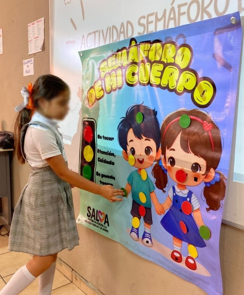 Con dinámicas estructuradas acorde a la edad, los equipos especializados explican a las y los pequeños estudiantes sobre lo que es la violencia y responden dudas.